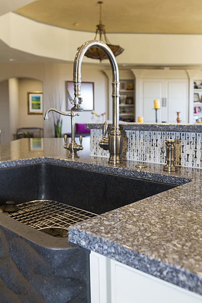 A: The process starts with creating a template on top of your existing countertops. We then cut and fabricate the slabs at our shop. Within a week, we’ll return to your home to remove the old countertops and install the new ones on the same day. We also offer sink disconnection and reconnection services, as well as stainless steel and composite sinks!
